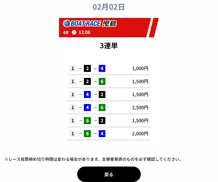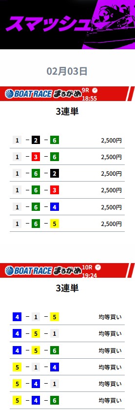 | 2026/02/02 | ![]() | 児島4R | 214 | 52.0倍 | 不的中 |