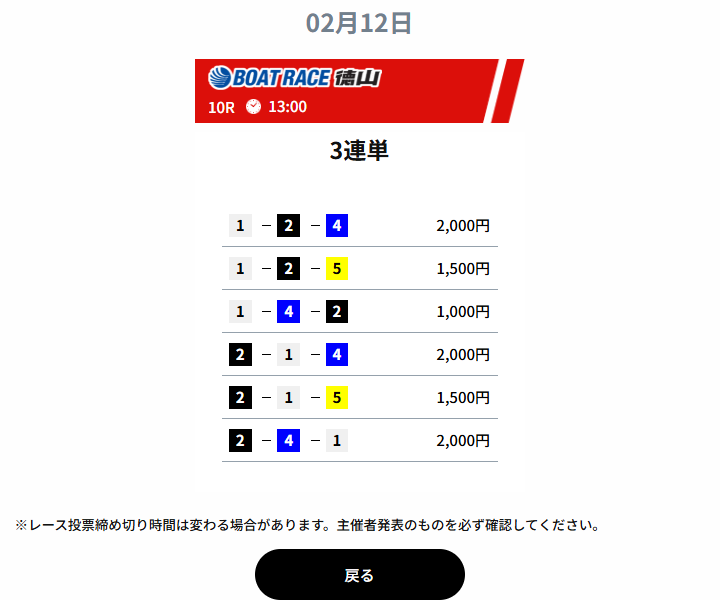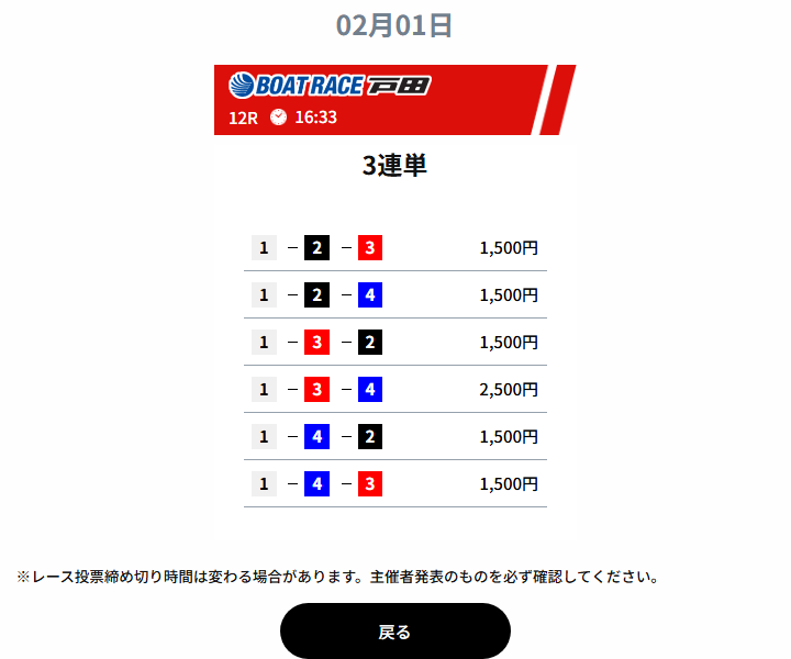 | 2026/02/01 | ![]() | 戸田12R | 134 | 6倍 | 150% |
