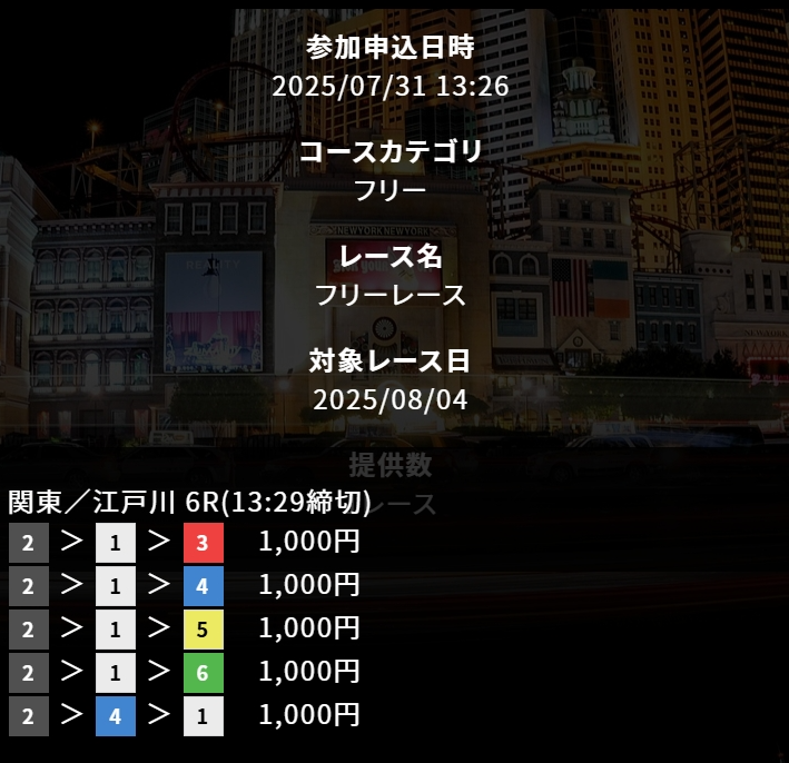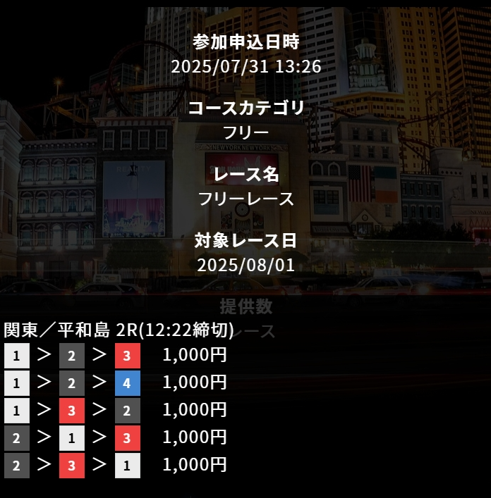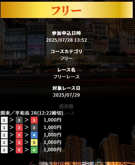 | 日付/開催地 | レース結果 | 回収率 | 画像 |