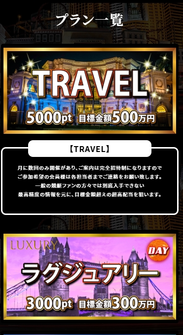 | 実現性の低いプランを高額で販売しており、非常に悪質です。1万円の投資で500万円の払戻金を狙うプランでは、オッズ110倍程度のレースを2連続で的中させる必要があります。このような高オッズのレースを2連続で的中させることは一般的には不可能です。このようなこれであれば、明らかに実績が出ていて安全性も保証されている予想サイトをはじめから使う方が絶対的に現実的です。 | |