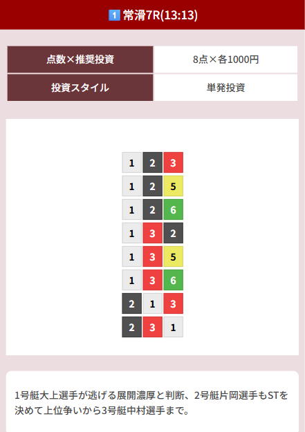 | 特徴 | 1号艇、4号艇にA級選手が入り残り4名がB級で番組が組まれます。 |