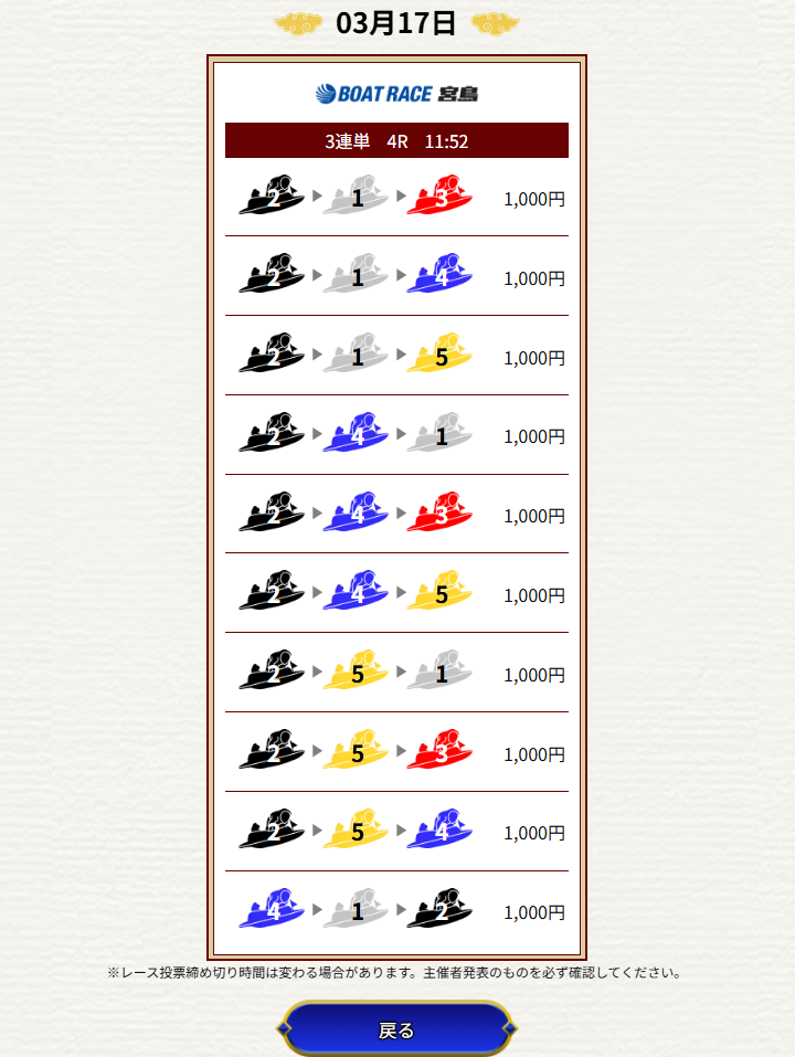 | 2026/03/17 | ![]() | 宮島4R | 215 | 15.1倍 | 151% |