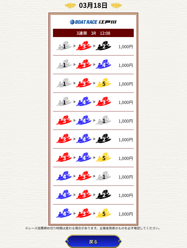 | 2026/03/18 | ![]() | 江戸川3R | 426 | 142.0倍 | 不的中 |