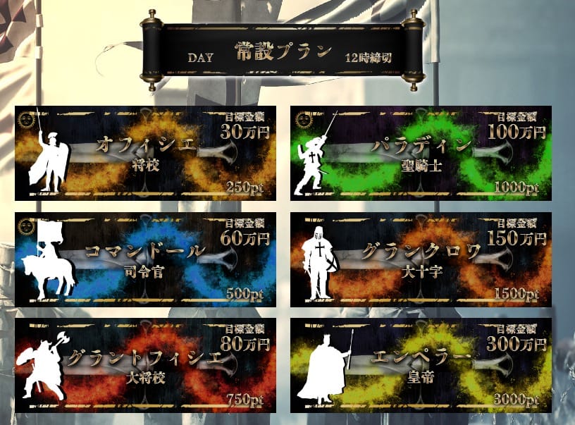 各プランに使用されている言葉は殆どがフランス語で、その他にはヨーロッパに関連した言葉や勲章の名称から作られています。時代背景が中世の帝国にしてあるので、この様な名称にしたのでしょう。