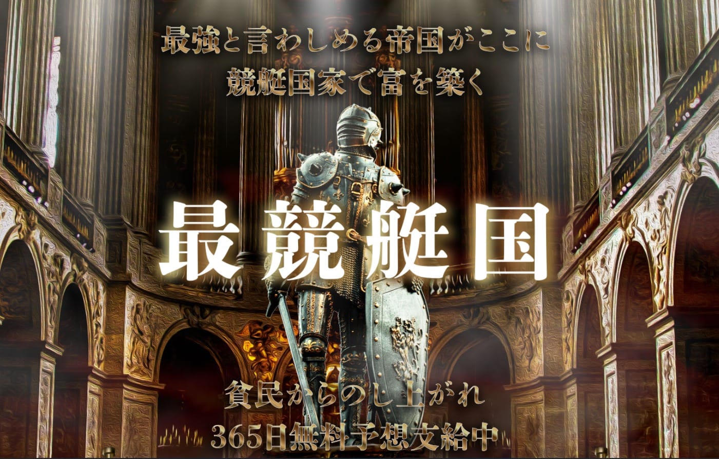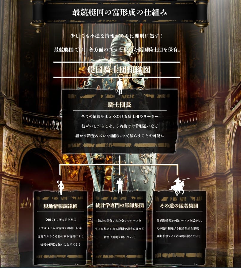 歴史的な背景をサイトのテーマとして活劇風にデザインしている様ですがかなり無理が有りますね。目的は競艇レースの的中なのですから、シンプルにレースの処理を獲得することを訴えるだけで良いのではないでしょうか?