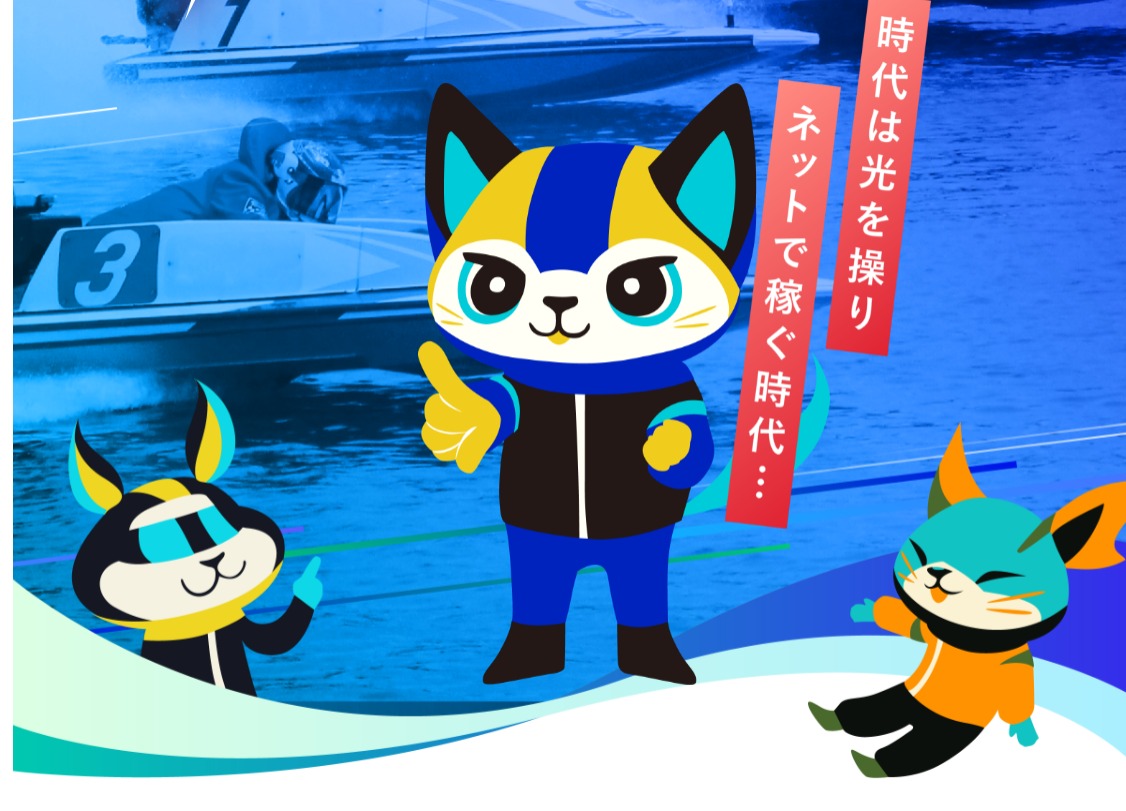 競艇王子かわいらしい猫のキャラクターが目に飛び込んできます。「時代は光を操りネットで稼ぐ時代・・・」というキャッチコピーがあります。