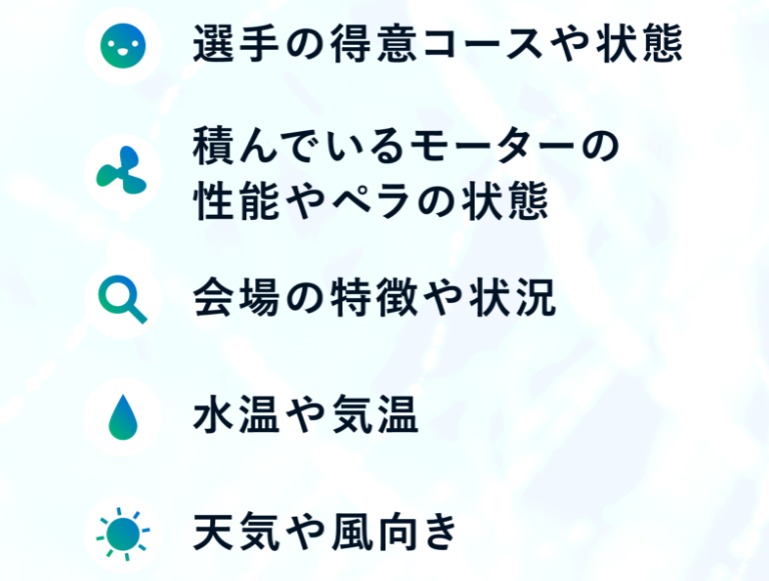 競艇王子予想の精査方法としては、コネを活かして情報を収集し、予想師による予想やスペシャリストによる情報分析を行うとのこと。収集する情報は、①選手の得意コースと状態 ②ペラ・モーター ③会場 ④水温・気温 ⑤天気・風向き の5つを挙げています。