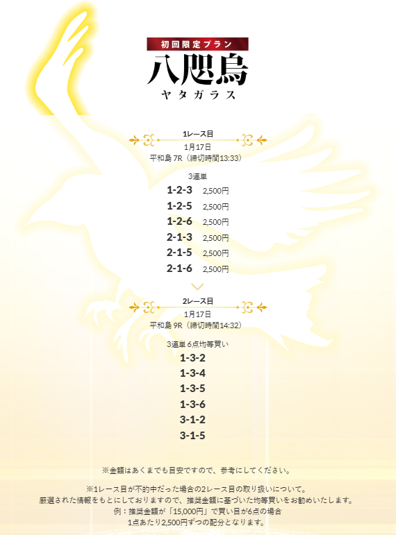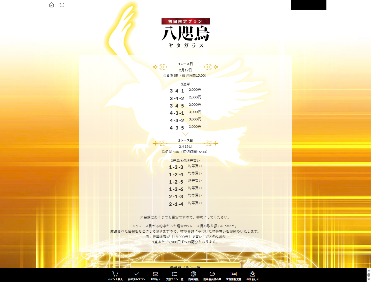 有料プランは全10種類。初回限定の「八咫烏(やたがらす)」と上級予想プランが3つ、厳選プランが4つ、お試し予想プラプランが3つ。価格は9千円~50万円と幅広いです。