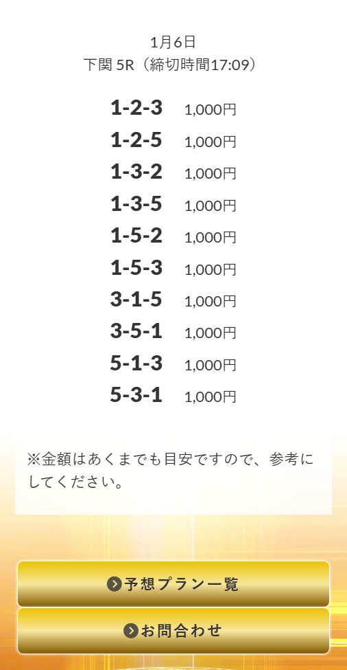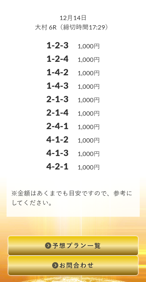 プロの予想、有料プランとはいえ、買えば必ず当たるという保証はないですが、的中成功した際にこれだけの払い戻しで還元されるのであれば買い続けるリスクも最小限に食いとどまりますし、当たればまずプラ確定ですからね。