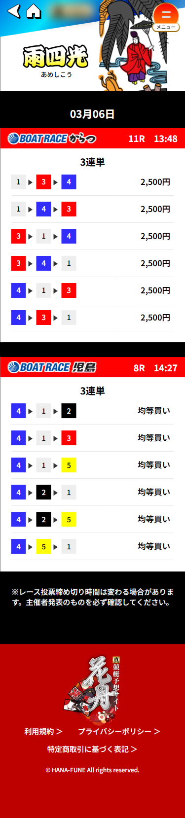 花舟の最高額プラン「雨四光(あめしこう)」へ参加しました。雨四光は2レースコロガシで150万円以上という高額の配当を狙うプランで、参加費用は12万円と高額です。