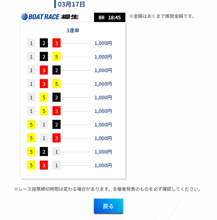 | 2026/03/17 | ![]() | 桐生8R | 531 | 48.3倍 | 483% |