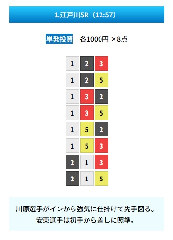 数字的にはパッとせず、これまでの内容もよく見て中堅止まりですが深川真二選手の手によりパワーが引き出されていて数字以上の評価が必要です。いいのは出足、行き足で特に行き足の部分は◎が付けられます。直前の山本梨菜選手はフライングにより戦線離脱。足は抜群だっただけに残念でした。今の状態は良好です。