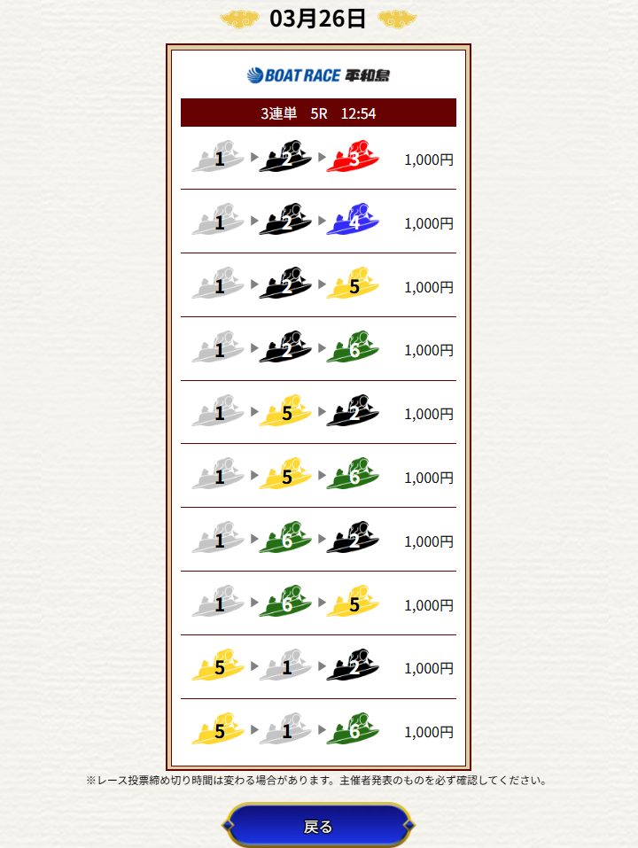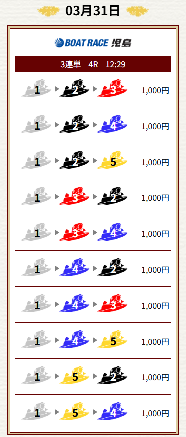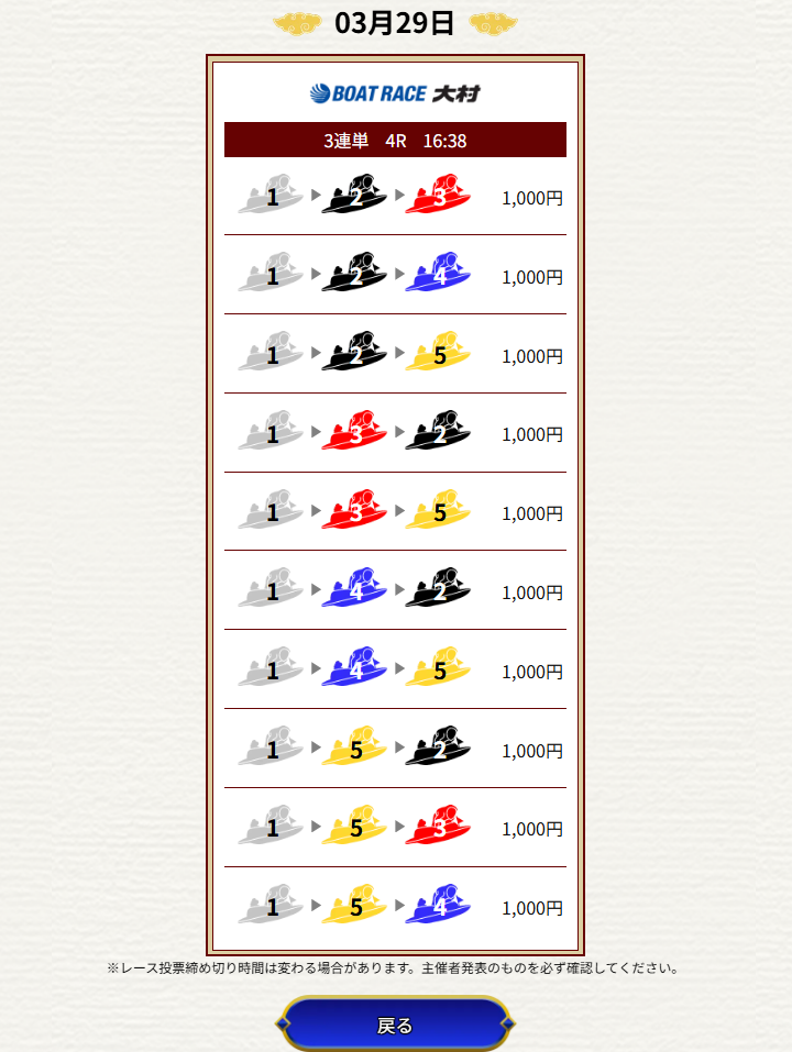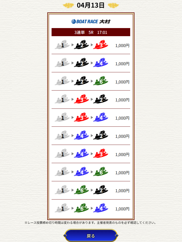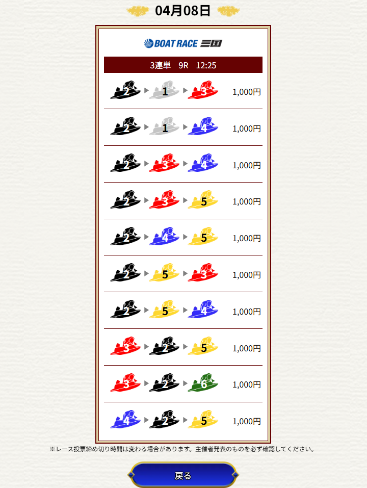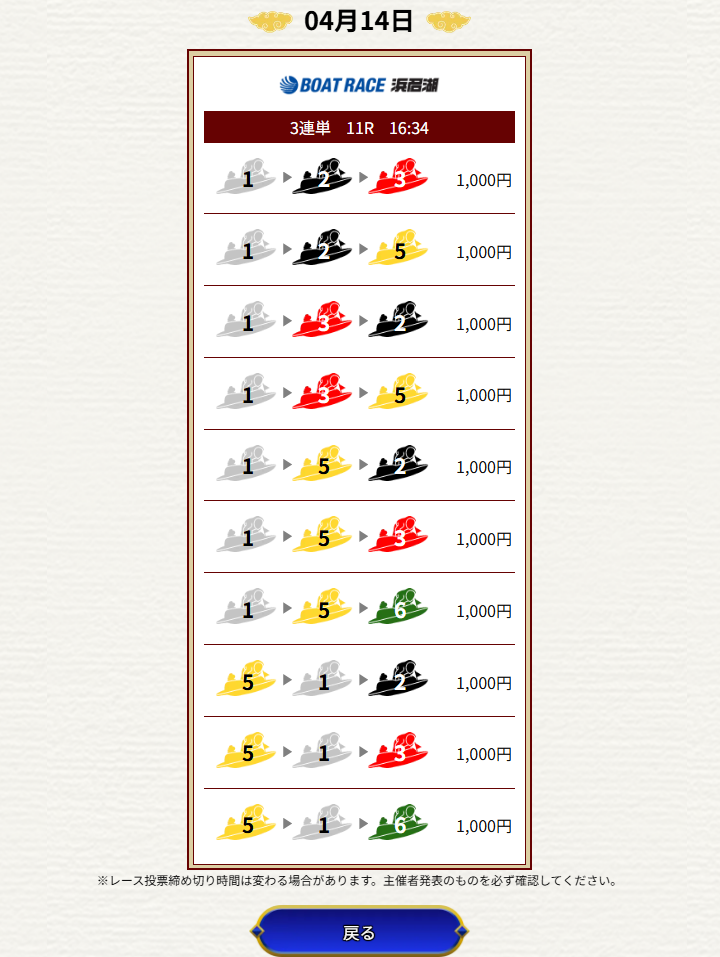重視していた1・2・4号艇で構成されており、的中。特に、「1号艇が2着になる可能性」と「4号艇を重視」した点が大きな成功ポイントです。オッズは41.5倍と中穴程度となりました。