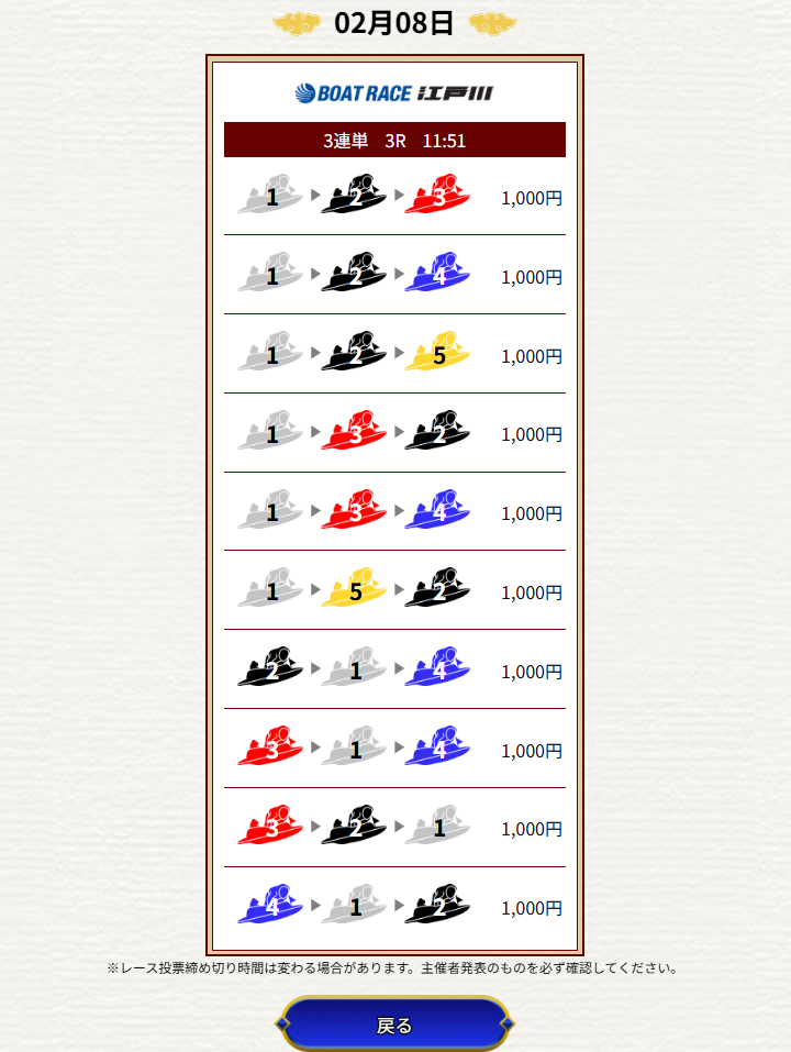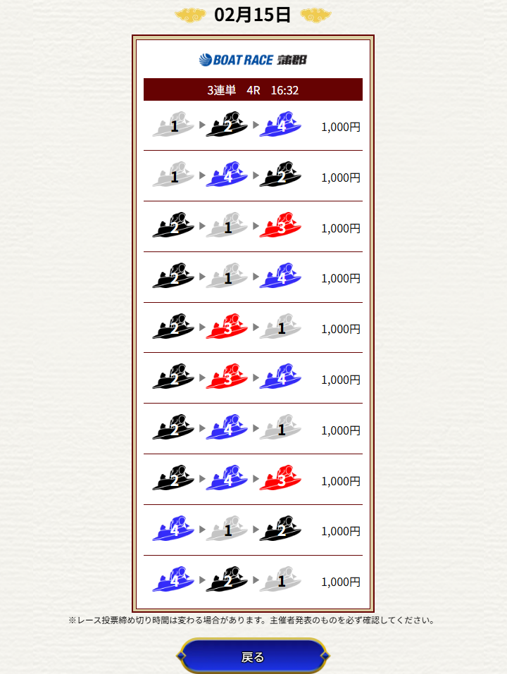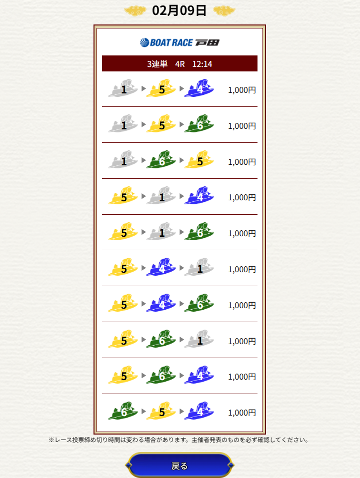 | 2026/02/09 | ![]() | 戸田4R | 615 | 53.8倍 | 不的中 |