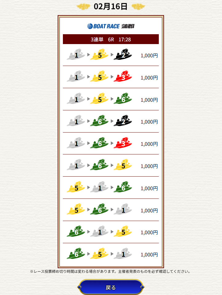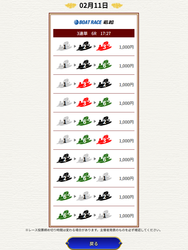 | 2026/02/11 | ![]() | 若松6R | 136 | 16.8倍 | 168% |
