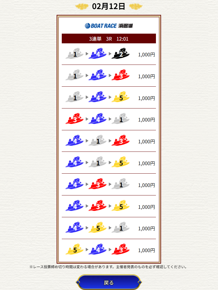 | 2025/12/01 | ![]() | 浜名湖4R | 412 | 38.0倍 | 不的中 |