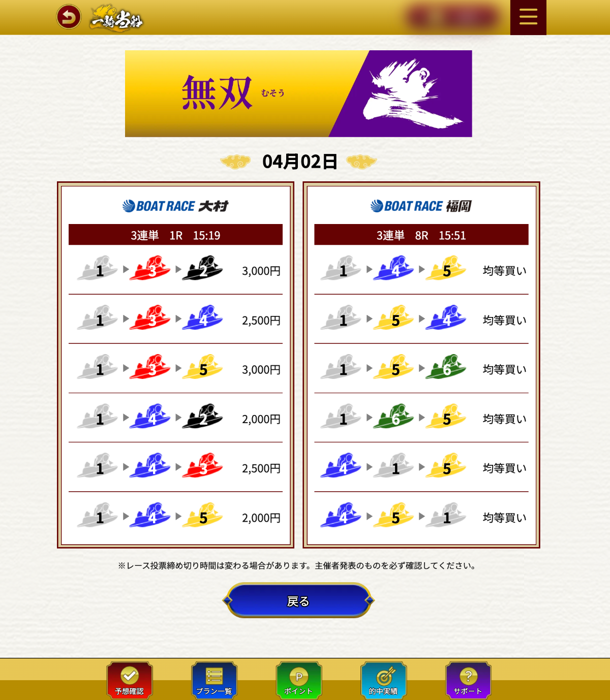 また、無料予想の実績が良いため最初の資金がないという方でも無料予想である程度資金貯めをしてその資金で有料プランに参加する、という組み立ても可能です。資金がなければ一攫千金はできないと思っている方、是非この「一騎当船」でその不可能を可能にしてみてください!