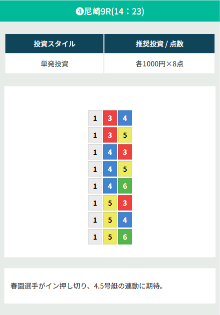 競馬のサイト何個か登録してたけど買い目が本当に多くて資金続かなくてすぐやめてしまった。ここは点数絞ってるのにそれなりに的中も出来て最高ですね。自分にはボートのほうが合ってるのかも。
