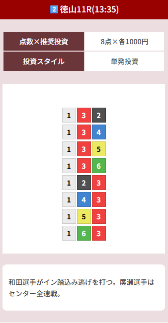 競馬のサイト何個か登録してたけど買い目が本当に多くて資金続かなくてすぐやめてしまった。ここは点数絞ってるのにそれなりに的中も出来て最高ですね。自分にはボートのほうが合ってるのかも。