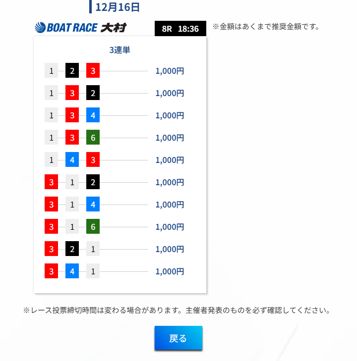 | 2025/12/16 | ![]() | 大村8R | 321 | 31.8倍 | 318% |