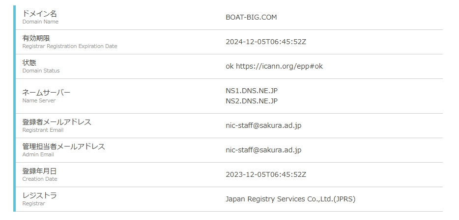 競艇王子次にビッグボートのドメイン「boat-big.com」について調べてみました。登録年月日は2024年12月5日となっています。本記事執筆時点で1年も経過していません。