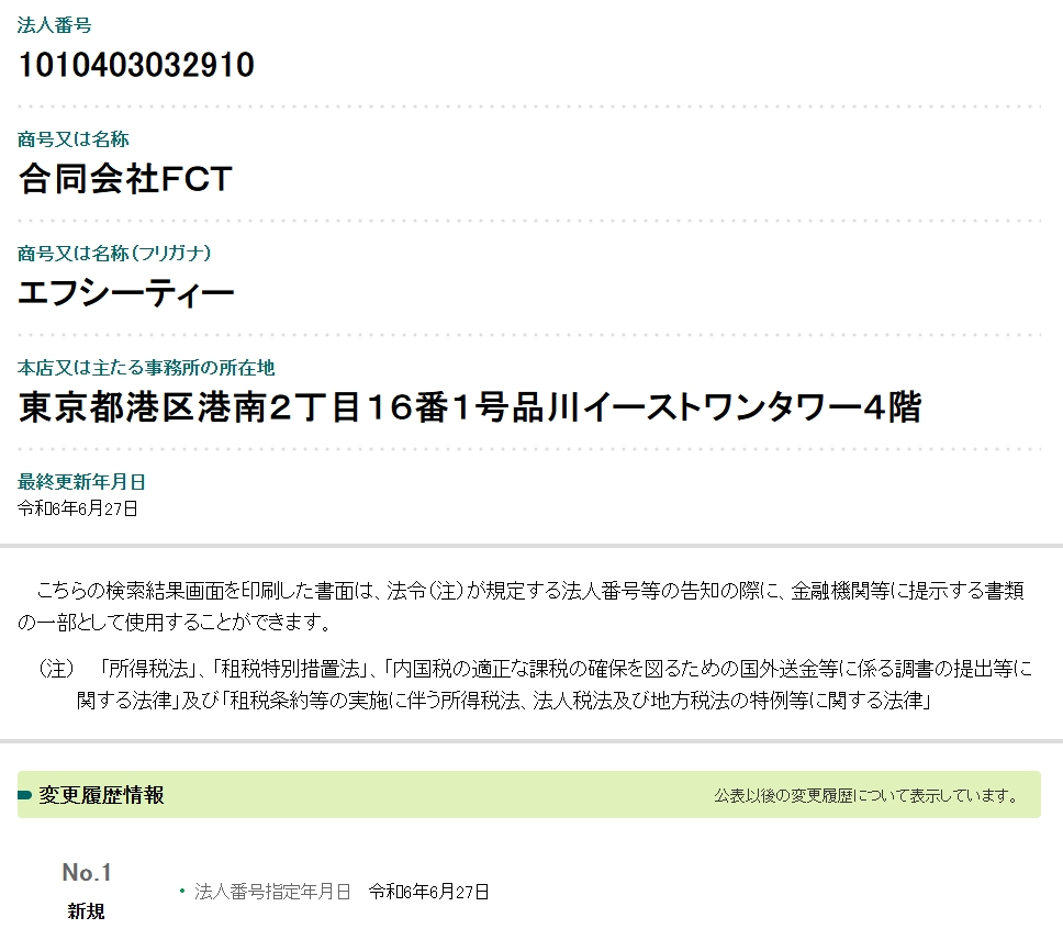 競艇王子運営事業者は「合同会社FCT」です。法人番号公表サイトで検索してみたところ、同じ住所で1件ヒットしました。この企業は、2024年6月に登録されたばかりです。