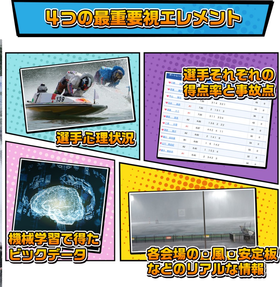 競艇王子ブルーラグーンの情報精査方法は、①選手心理状況 ②得点率と事故点 ③ビッグデータ ④風や安定板などのリアルな情報の4つです。