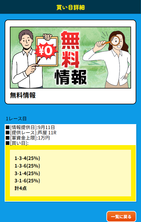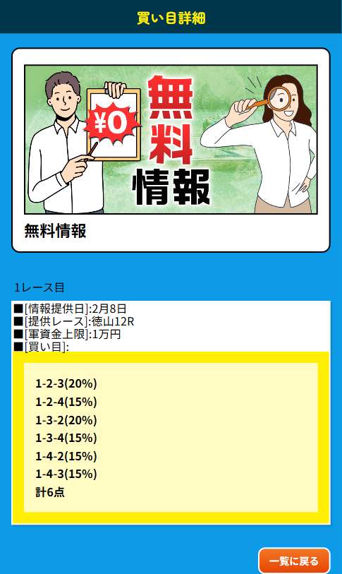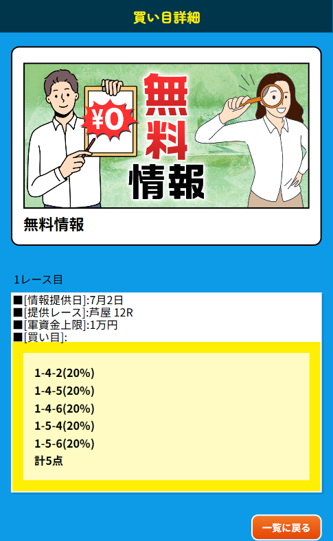無料情報は、1日1レースで5点前後の買い目で情報が配信されます。配信日は毎日です。
