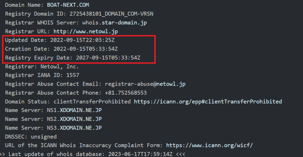 競艇王子この情報はサーバーの確保のために行われ、第三者による登録ですので改ざんの心配はない唯一の情報です。ボートネクストのサイト登録は2022/9/15と成っています。サーバー登録の登録有効期間は2027/9/15の5年間です。結論すると、このサイトは昨年、2022/9/15に誕生した比較的新しい予想サイトという事になります。
