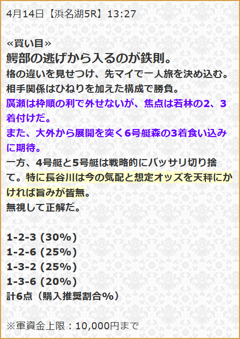 | 2026/04/14 | ![]() | 浜名湖5R | 125 | 3.6倍 | 不的中 |