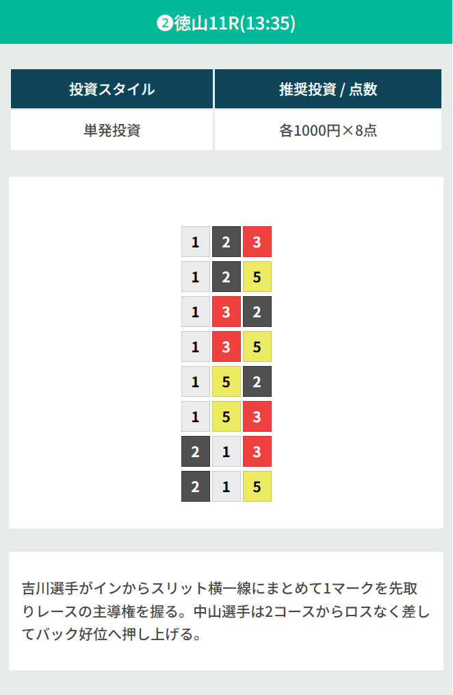 | 2026/04/03 | ![]() | 徳山11R | 124 | 7.6倍 | 95% |