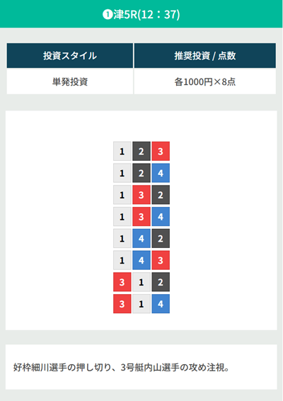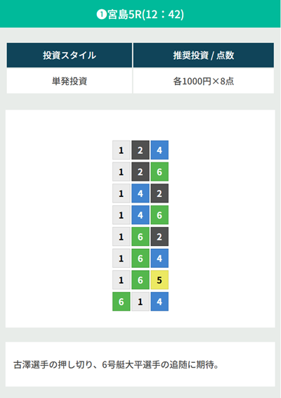 | 2026/04/14 | ![]() | 宮島5R | 163 | 52.8倍 | 不的中 |