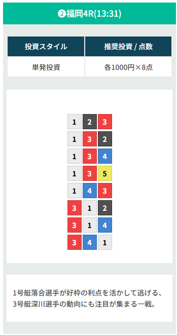 | 2026/03/27 | ![]() | 福岡4R | 123 | 11.2倍 | 140% |