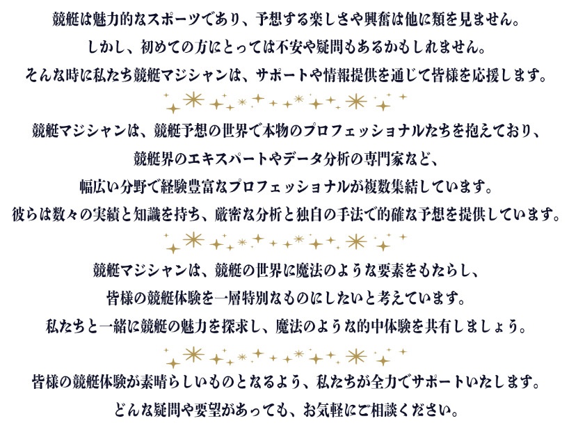 予想方法については、次のような記載がありました。「競艇予想の世界で本物のプロフェッショナルたちを抱えており、競艇界のエキスパートやデータ分析の専門家など、幅広い分野で経験豊富なプロフェショナルが複数集結しています。彼らは数々の実績と知識を持ち、厳密な分析と独自の手法で的確な予想を提供しています。