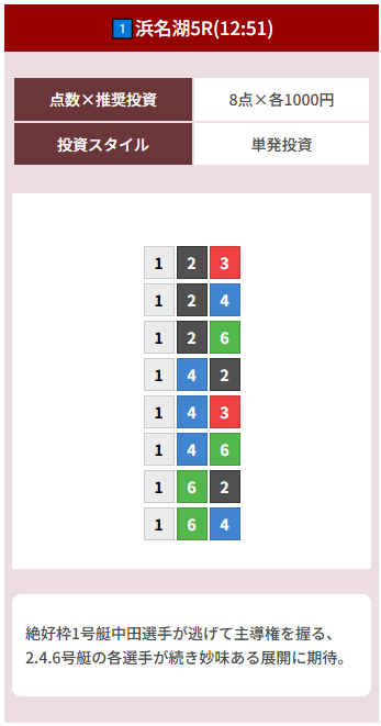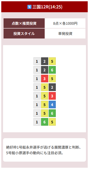 | 2026/03/12 | ![]() | 鳴門12R | 162 | 103.0倍 | 不的中 |