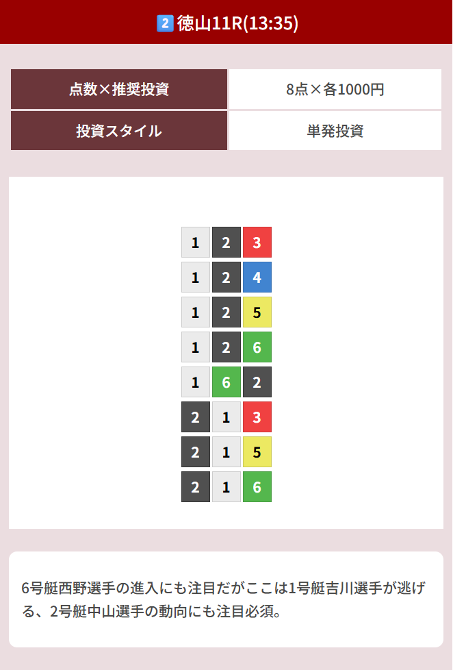 | 2026/04/03 | ![]() | 徳山11R | 124 | 7.6倍 | 95% |