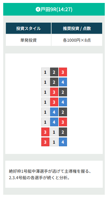 競馬のサイト何個か登録してたけど買い目が本当に多くて資金続かなくてすぐやめてしまった。ここは点数絞ってるのにそれなりに的中も出来て最高ですね。自分にはボートのほうが合ってるのかも。