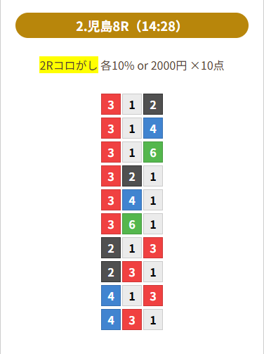 全レースとも連単2レースのコロガシで情報提供されている。常設の通常プランの情報料はレース内容により幅が有り150pt~9800ptとなっていますので、ご自身の予算に合わせてご利用を検討される方が良いじゃろう。