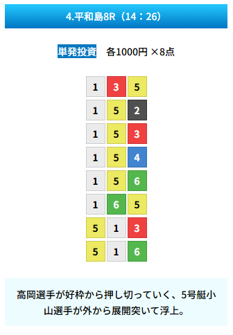 10の予想のうち8つは、1号艇を1着に固定。イン逃げ鉄板という読みですね。