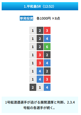 10の予想のうち8つは、1号艇を1着に固定。イン逃げ鉄板という読みですね。