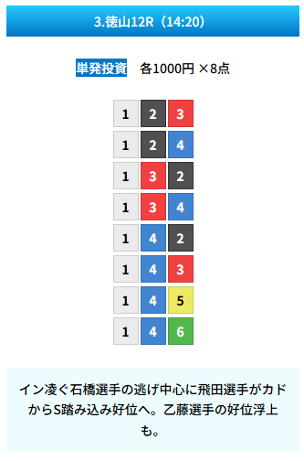 | 2026/04/01 | ![]() | 徳山12R | 142 | 9.4倍 | 117% |