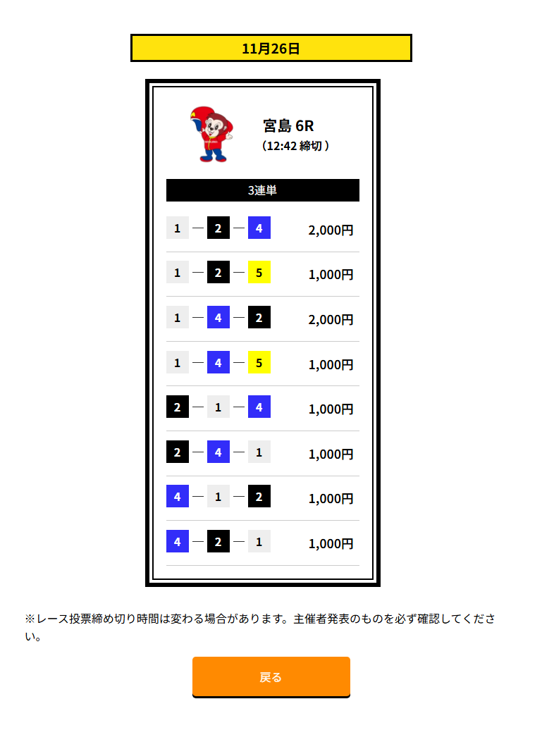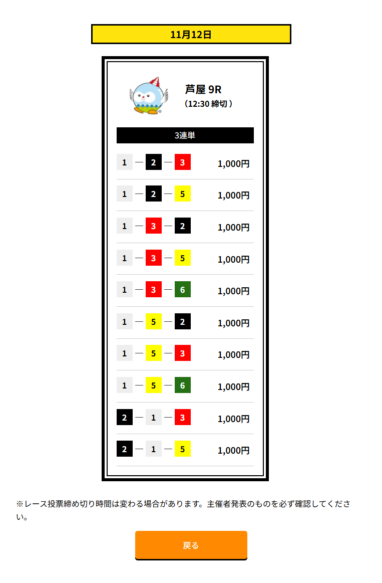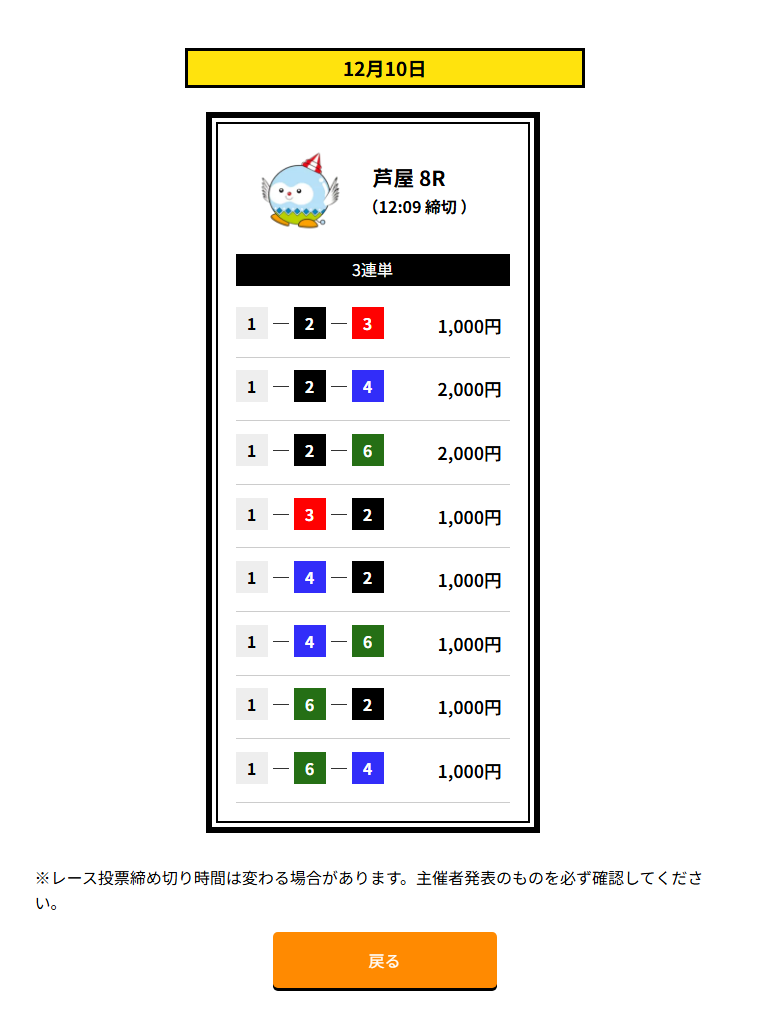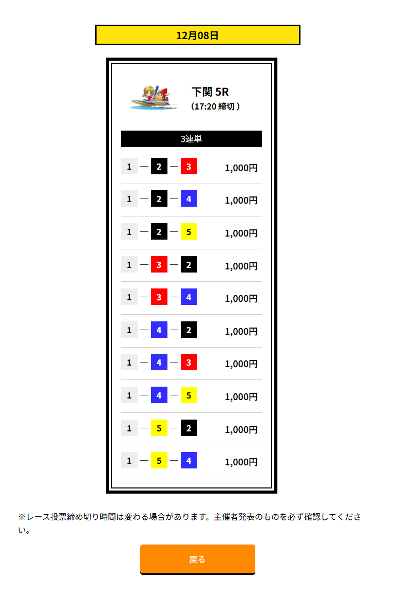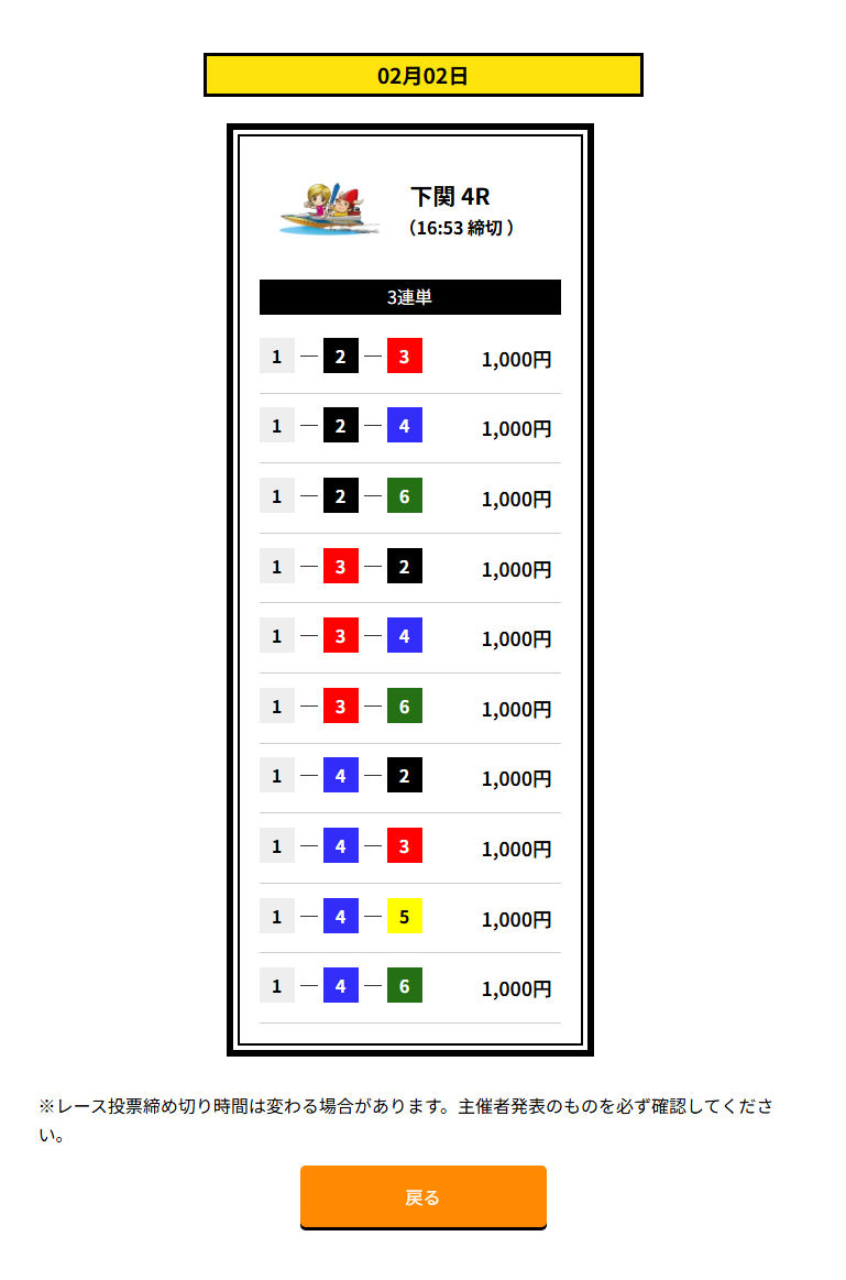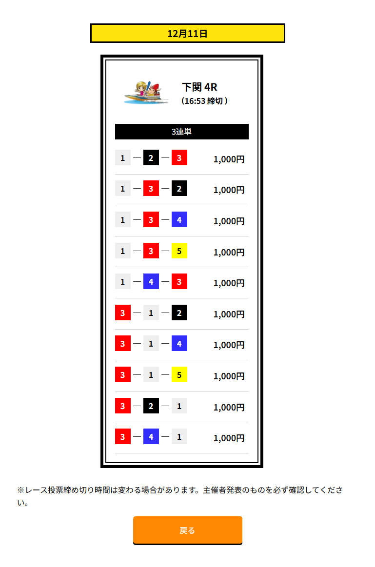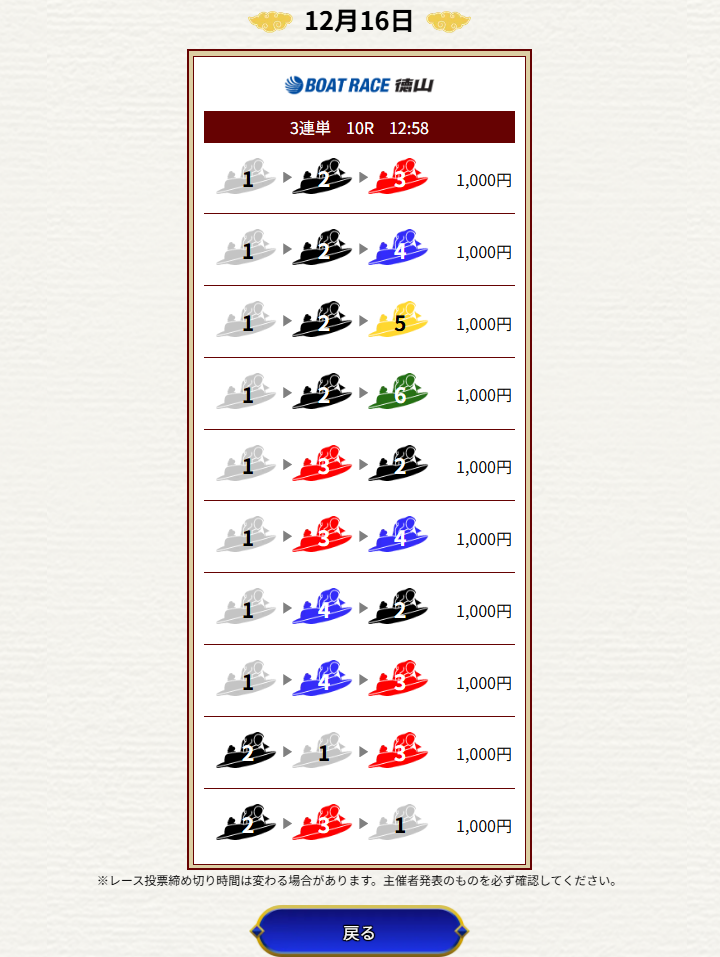 すべて1号艇を頭とした買い目になっています。1号艇が必ず1着になると強く信頼していることがわかります。相手には3号艇と4号艇を中心に、2・5号艇まで広げて押さえています。