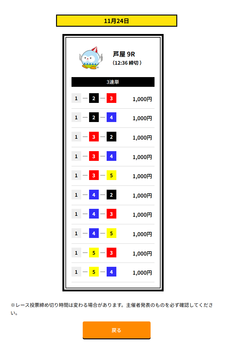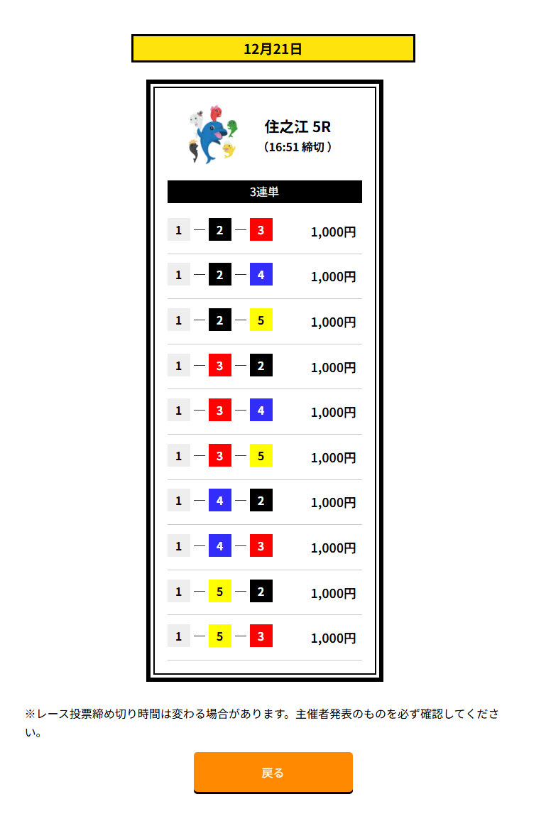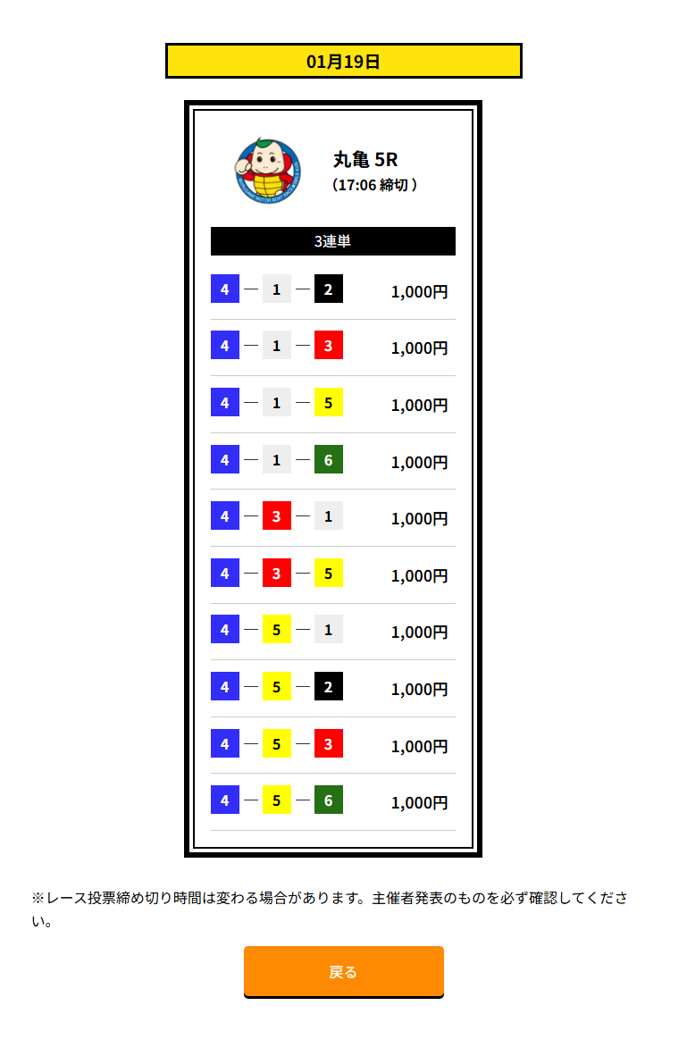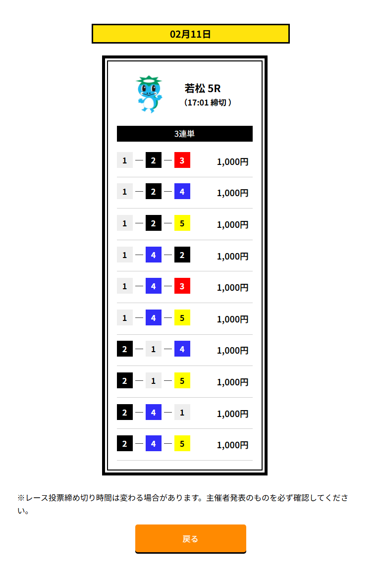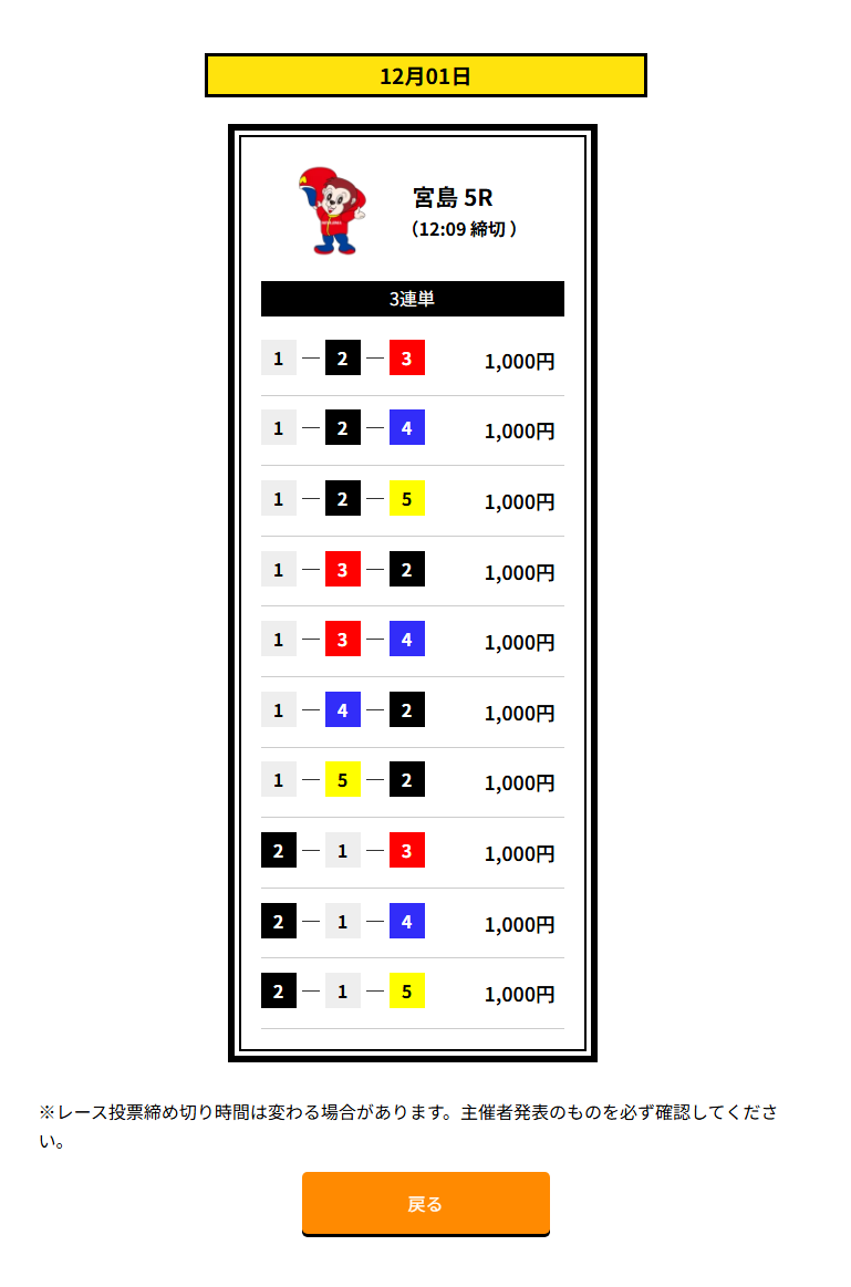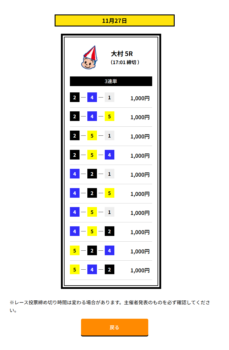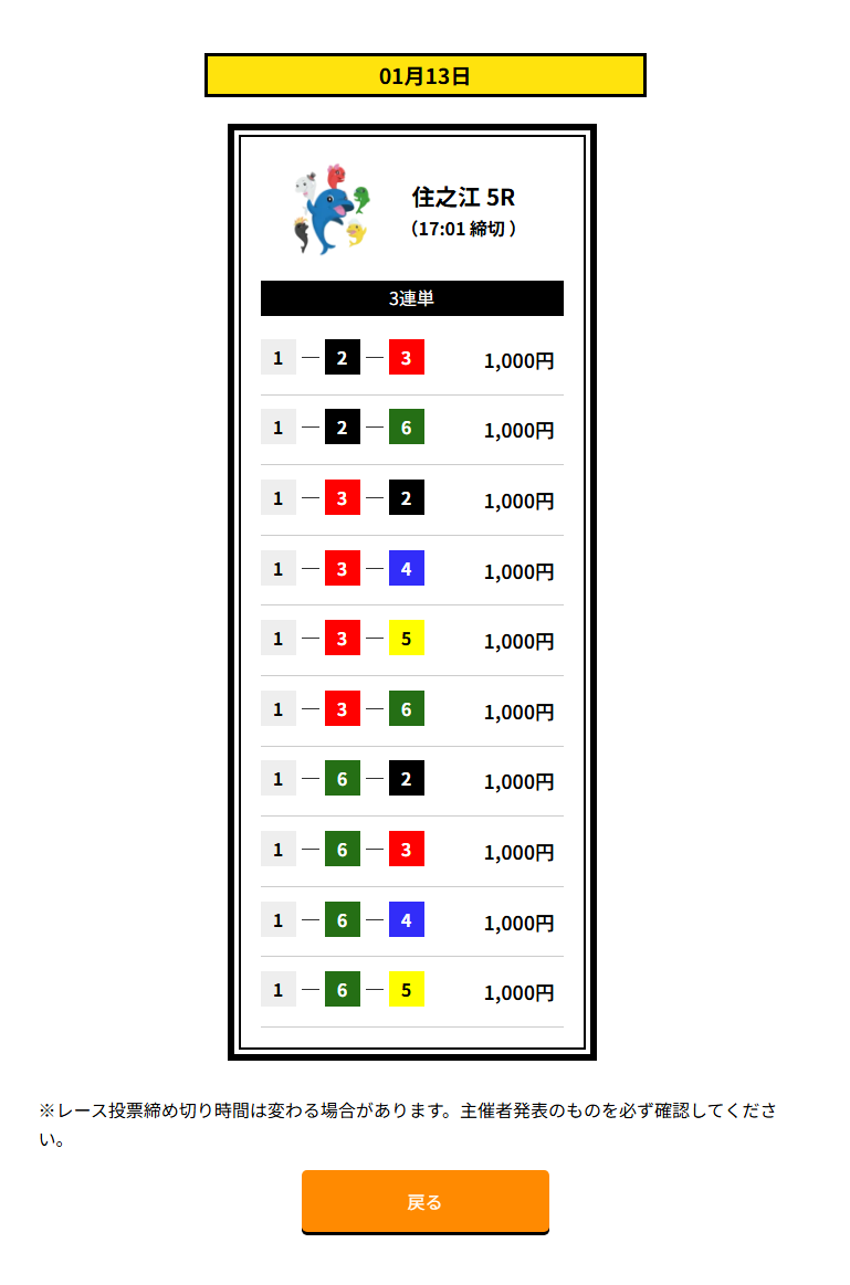 すべて1号艇を頭とした買い目になっています。1号艇が必ず1着になると強く信頼していることがわかります。相手には3号艇と4号艇を中心に、2・5号艇まで広げて押さえています。