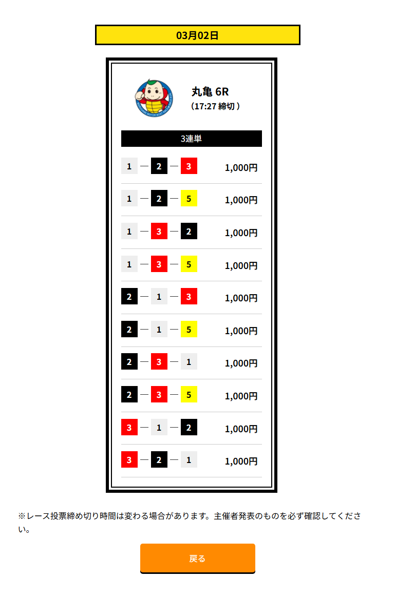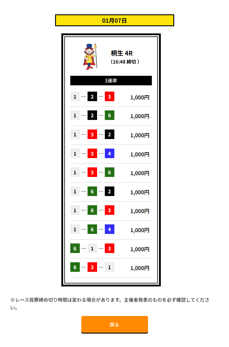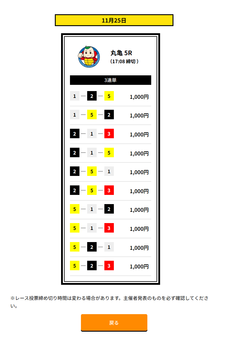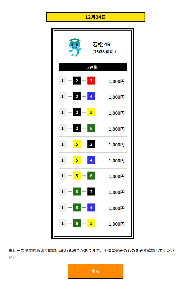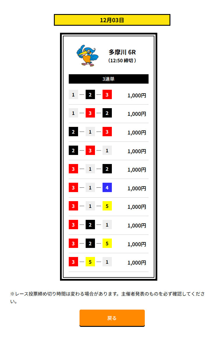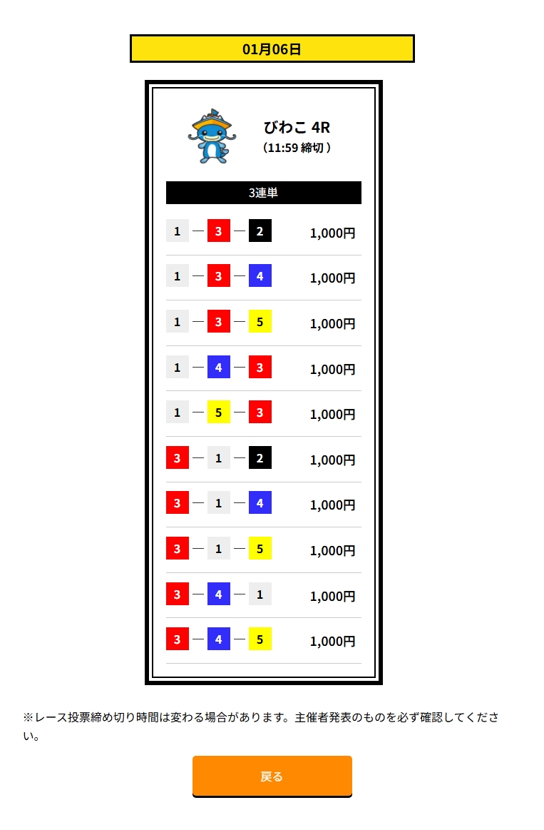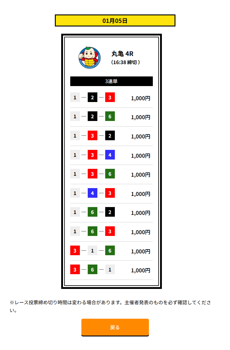 すべて1号艇を頭とした買い目になっています。1号艇が必ず1着になると強く信頼していることがわかります。相手には3号艇と4号艇を中心に、2・5号艇まで広げて押さえています。