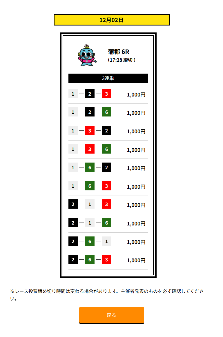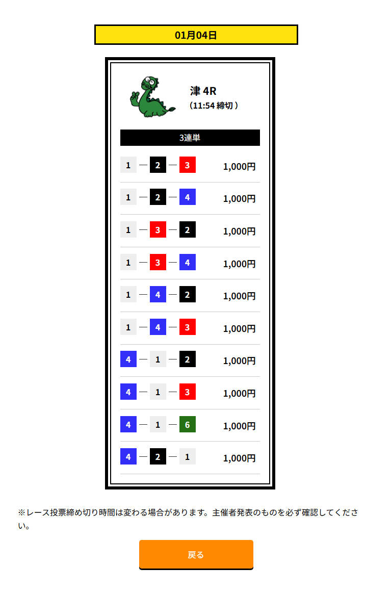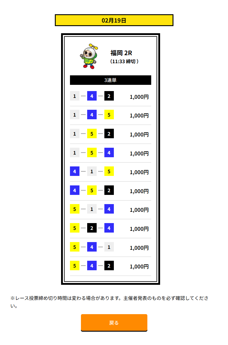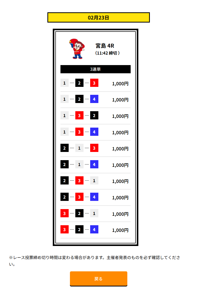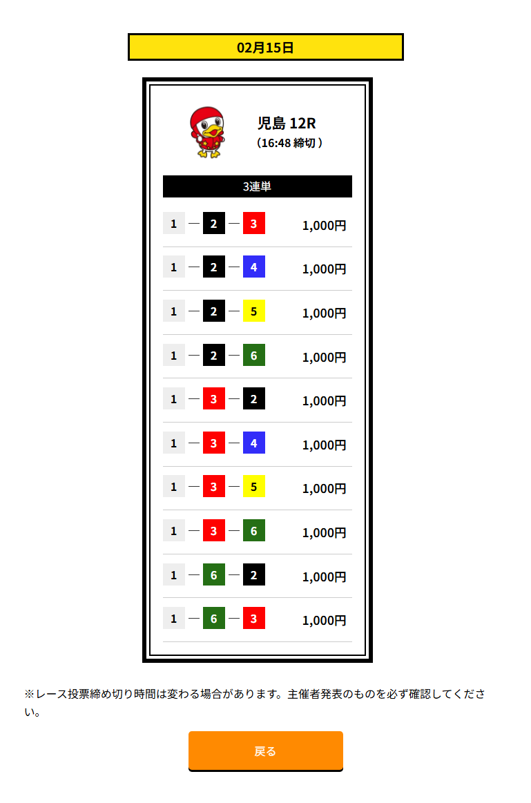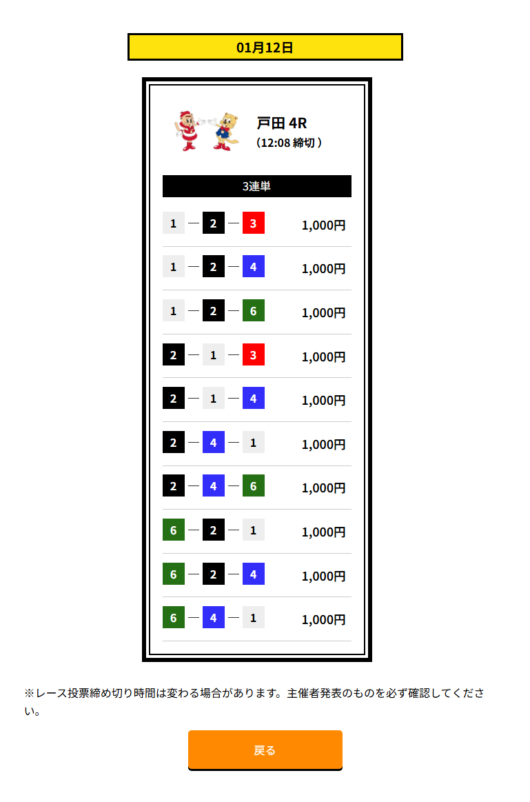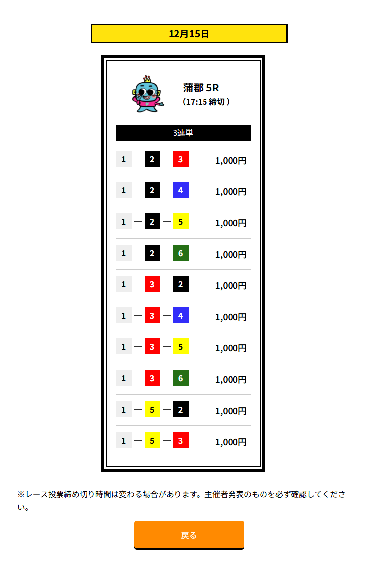 すべて1号艇を頭とした買い目になっています。1号艇が必ず1着になると強く信頼していることがわかります。相手には3号艇と4号艇を中心に、2・5号艇まで広げて押さえています。