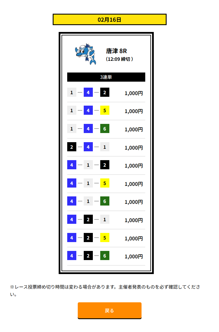 1-3-4は人気筋の本線の一つでした。1号艇の勝利を軸に、2着に3・4号艇を厚めに想定しており、的中です。大衆の見方と一致しており、オッズは16.0倍となりました。